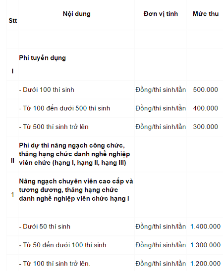 Mức thu phí tuyển dụng, dự thi nâng ngạch, thăng hạng công chức, viên chức được quy định như sau: