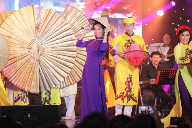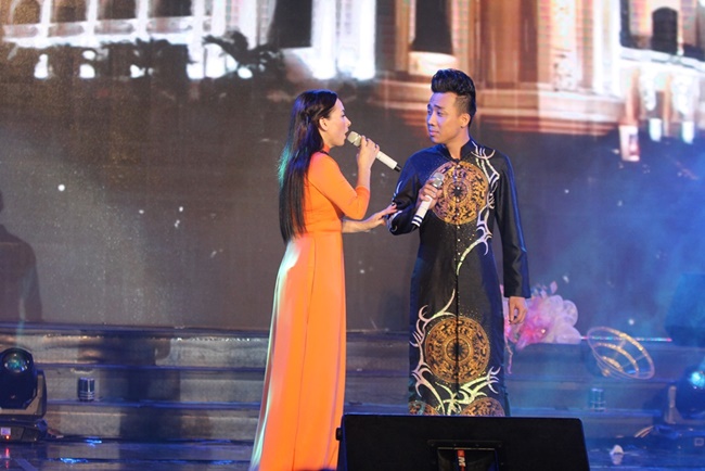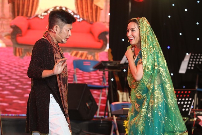 | Nữ ca sĩ cũng thể hiện khả năng hát cải lương qua tiết mục "Nửa đời hương phấn" cùng nghệ sĩ Kim Tử Long. |