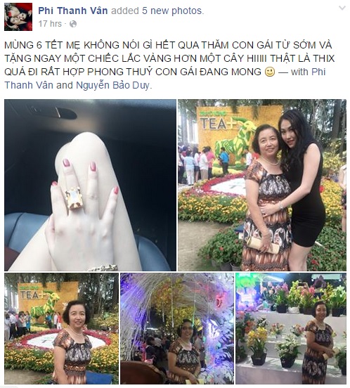 Cùng với đó là những hình ảnh Phi Thanh Vân thân thiết cùng mẹ và khéo léo khoe chiếc lắc vàng mới được tặng, hơn nữa chiếc nhẫn trên tay cô cũng khiến nhiều người "choáng váng". Người hâm mộ của Phi Thanh Vân đều dành những lời chúc năm mới cho cô và ngưỡng mộ tình cảm của nữ diễn viên và mẹ.