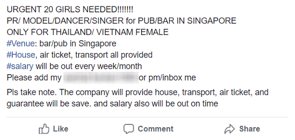 Trên các mạng xã hội, không khó để người dùng tìm thấy những thông báo tuyển nhân viên với mức lương “trên trời”, không yêu cầu kinh nghiệm hay ngoại ngữ chỉ cho công việc phục vụ trong nhà hàng ăn, giúp việc gia đình hoặc quán massage. Cùng với đó, cộng đồng người lao động bất hợp pháp ở Singapore hoặc Malaysia - hai quốc gia được coi là điểm nóng của thị trường lao động nước ngoài tại Đông Nam Á, đã quen với các dịch vụ của “môi giới” hoặc “đại lý”.