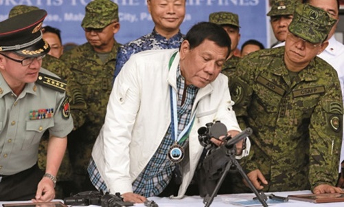 Tổng thống Philippines Rodrigo Duterte kiểm tra lô vũ khí do Trung Quốc trao tặng hồi tháng 6/2017. Ảnh: Inquirer. |