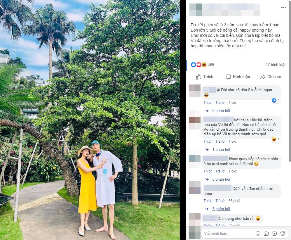 Được biết, bức ảnh này được đăng tải trong một nhóm kín dành cho các fan “Về nhà đi con” với nội dung: “Dự kết phim sẽ là 3 năm sau: lúc này kiếm 1 bạn Bon lớn 3 tuổi để đóng cái happy ending này. Chứ mới có vài cái biến, Bon chưa kịp biết bò mà Vũ đã kịp trưởng thành rồi Thư vị tha và gia đình tụ họp thì nhanh siêu tốc quá nhỉ?”.