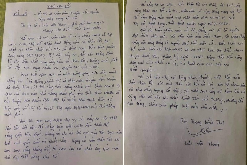 Ngày 14/4, ông Lưu Văn Thanh- Phó Chủ tịch HĐND huyện Hớn Quản (Bình Phước), đã viết tâm thư công khai xin lỗi nhân dân và xin được từ chức.