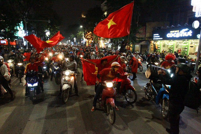 Người dân ăn mừng chiến thắng sau trận U23 Việt Nam- U23 Iraq. Ảnh: Dân Việt |