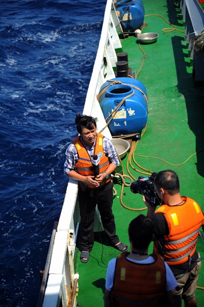 | Phóng viên Mạnh Cường liên tục đưa tin từ vùng biển Hoàng Sa. |