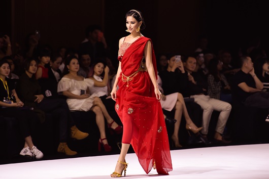 Hoa hậu Trái Đất 2018 khiến giới mộ điệu thời trang sửng sốt với hình ảnh cực kỳ mới lạ và thu hút. Diện trang phục truyền thống của Ấn Độ, Phương Khánh nổi bật trên sàn catwalk với sắc đỏ quyến rũ. |