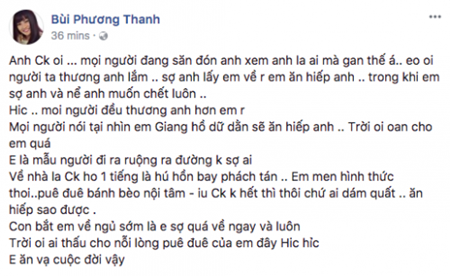 Trước những bình luận tò mò về danh tính ông xã Phương Thanh, cô cho biết “anh chồng” là người mình rất nể và sợ. Phương Thanh khẳng định thêm bản thân là mẫu người về nhà “chồng ho một tiếng là hú hồn, hồn bay phách tán”.