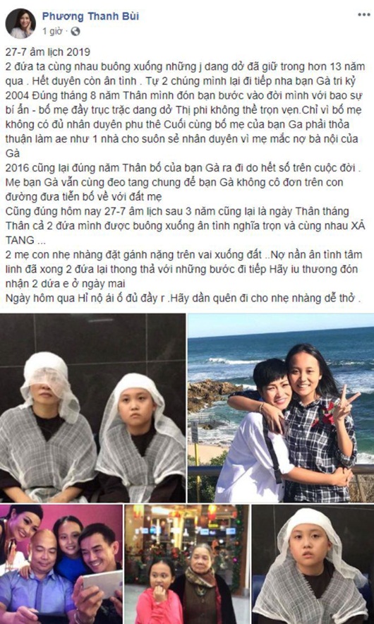 Phương Thanh kể: “27/7 Âm lịch 2019, hai đứa ta cùng nhau buông xuống những gì dang dở đã giữ trong hơn 13 năm qua. Hết duyên còn ân tình”.