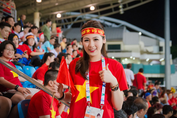 Trên khán đài sân Bishan tối 4/6 xuất hiện các bóng hồng của Việt Nam là Hoa hậu Đại Dương Đặng Thu Thảo, Á hậu Dương Tú Anh và ca sĩ Phương Thanh.