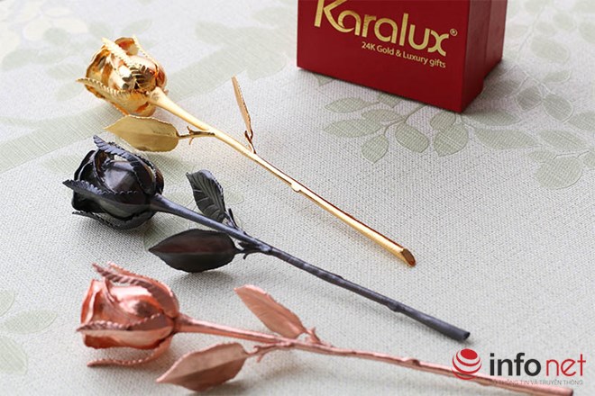 Để phục vụ nhu cầu tặng quà 20/10, một đơn vị mạ vàng ở Hà Nội tung món quà lạ 20/10 đó là bông hồng dát vàng với 3 màu đặc biệt. Tùy theo kích cỡ, màu sắc mà sản phẩm có giá khác nhau, dao động 2-4 triệu đồng một bông.
