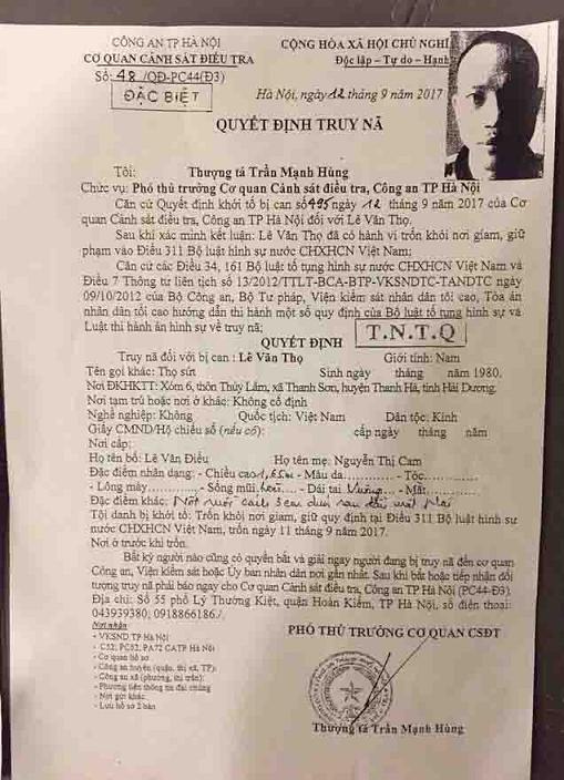 Truy nã toàn quốc đối với Lê Văn Thọ - Ảnh: Vietnamnet |