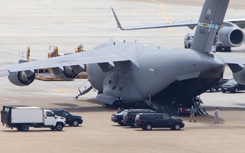 | Trong các chuyến công du nước ngoài, đoàn xe hộ tống Tổng thống Mỹ sẽ được vận chuyển bằng máy bay vận tải C-17 Globemaster III. |