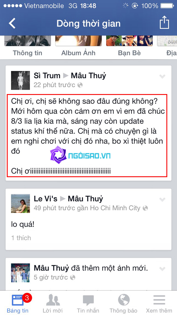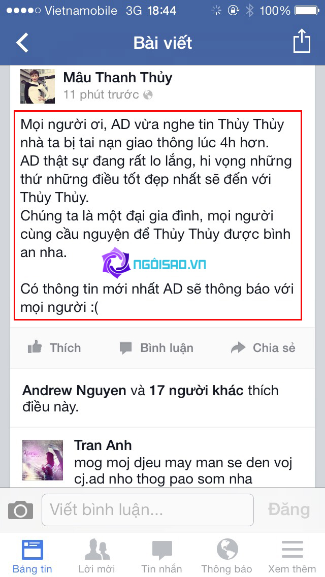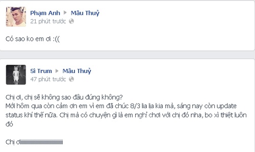 Bắt nguồn từ một chia sẻ trên trang cá nhân của Mâu Thanh Thủy với nội dung: "Chị ơi, chị sẽ không sao đâu đúng không? Mới hôm qua còn cám ơn em vì em đã chúc 8/3 lia lịa cơ mà. Sáng nay còn uplate khí thế nữa. Chị mà có chuyện gì là em nghỉ chơi với chị đó nha. Bo xì thiệt luôn đó. Chị ơi!!!