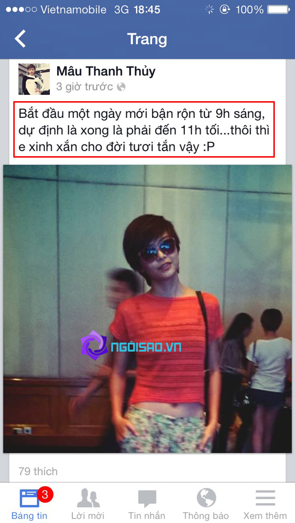 Đoạn status thông báo trên Fanpage của quán quân VNTM 2013.