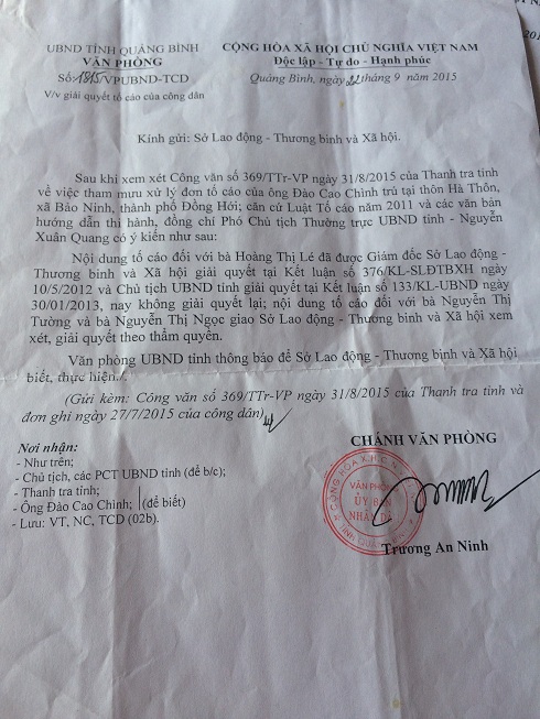 Và gần đây nhất, ông Chình nhận được công văn của UBND tỉnh Quảng Bình do Chánh Văn phòng Trương An Ninh ký ngày 22/9/2015. Theo công văn này đã đưa bà Hoàng Thị Lé (1 trong 3 người bị tố cáo) đã được đưa ra khỏi danh sách với lý do đã được giải quyết tại Kết luận số 376 /ngày 10/5/2012 và Phó Chủ tịch UBND tỉnh giải quyết tại Kết luận 133/ngày 30/1/2013, nay không giải quyết lại.Còn đối với trường hợp bà Nguyễn Thị Tường và Nguyễn Thị Ngọc giao Sở LĐTB&XH giải quyết theo thẩm quyền.