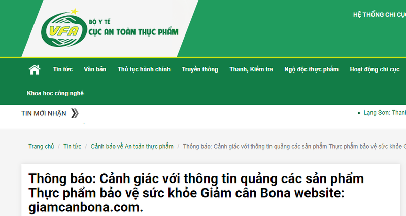 Trong quá trình các cơ quan chức năng tiếp tục xử lý vụ việc, để tránh việc mua, sử dụng hàng giả, hàng kém chất lượng, quảng cáo không đúng sự thật, lừa dối người tiêu dùng, Cục An toàn thực phẩm, Bộ Y tế cảnh báo người tiêu dùng không mua, không sử dụng các sản phẩm Thực phẩm bảo vệ sức khỏe Giảm cân Bona tại website giamcanbona.com.