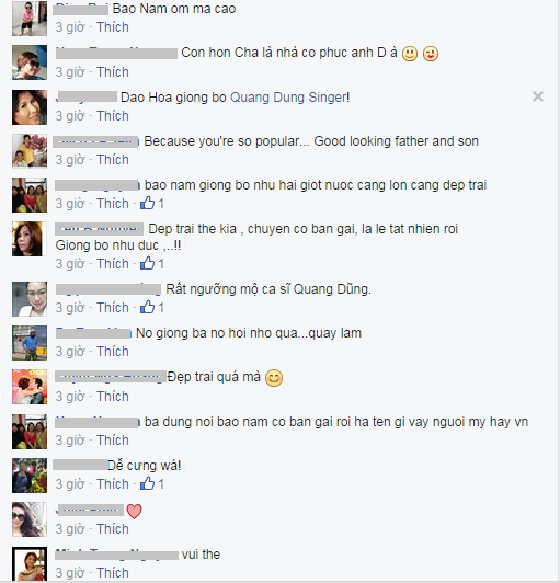 | Bạn bè và cộng đồng mạng giành nhiều lời khen ngợi cho hai bố con Quang Dũng. |