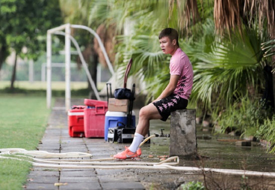 Ở buổi tập chiều 3/7 của Hà Nội FC, Quang Hải không tập luyện vì chấn thương. Anh ngồi một mình phần lớn thời gian buổi tập theo dõi các đồng đội tập luyện.
