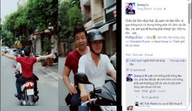 Trên trang cá nhân của nam ca sĩ Quang Lê, anh đã cho đăng tải hai bức ảnh đầu trần không đội mũ bảo hiểm khi ngồi trên xe máy.