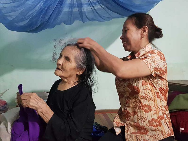 Bà Thu chăm sóc cụ Mịch như mẹ ruột của mình. Ảnh: PLO |