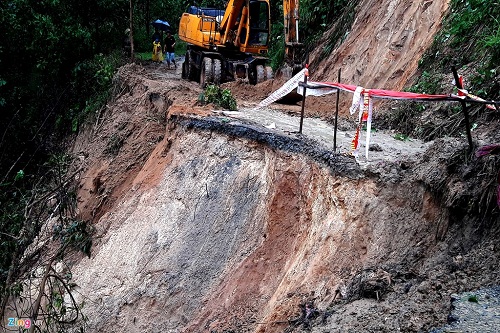 Tuyến đường ĐH 8 từ xã Trà Đốc đi Trà Bui bị sạt lở gần 30m. Ảnh: Tri thức trực tuyến. |