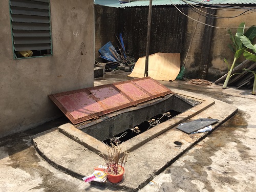 Sau cuộc trò chuyện ông L đã dẫn PV đến mục sở thị hố thải “tử thần”, xung quanh khu vực được xây tường bao, cửa sắt ra đóng vào khoá. Nắp bể được làm bằng sắt, trong bể có đường ống dẫn nước lớn đường kính chừng 50 cm. Được biết nước thải của toàn phố sẽ được xả thẳng vào bể này qua đường ống trên. Tuy nhiên chính PV sau khi quan sát bể chưa nước xong cũng không thể đứng được lâu do mùi nước thải xộc lên, khiến PV đau đầu phải đi ra ngay.