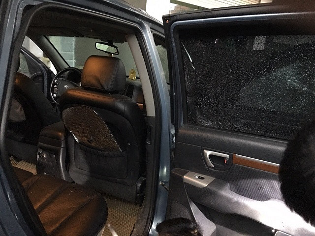 | Chiếc ôtô của vợ anh Kiên bị "dính" nhiều vết đạn. Ảnh: báo Giao thông |