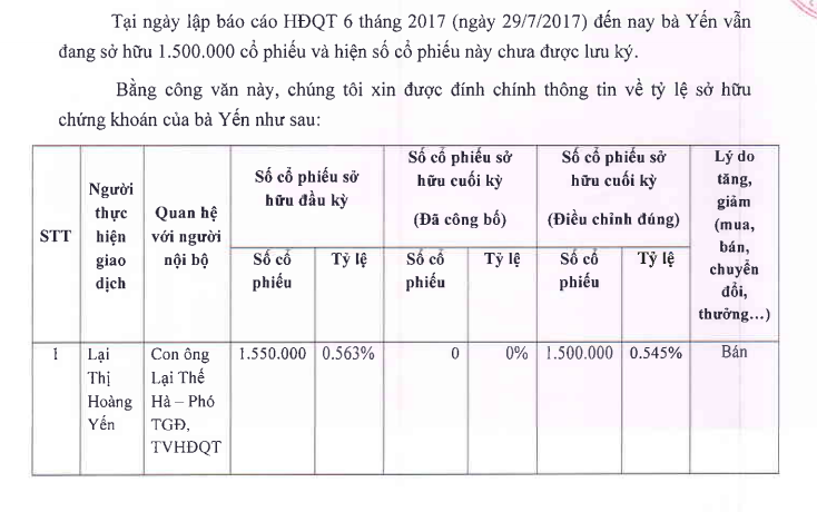 Tại ngày lập báo cáo HĐQT 6 tháng năm 2017 (ngày 29/7/2017) đến nay bà Yến vẫn đang sở hữu 1,5 triệu cổ phiếu và số cổ phiếu này hiện vẫn chưa được lưu ký.
