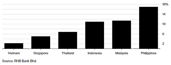 Theo Ngân hàng RHB, khoảng 16,9% hàng hóa xuất khẩu của Philippines thuộc về Trung Quốc. Đây là con số khá cao so với 11,4% của Malaysia và 2,2% của Việt Nam và cho thấy xuất khẩu hàng sang Trung Quốc là nguồn thu ngoại tệ quan trọng với quốc gia này.