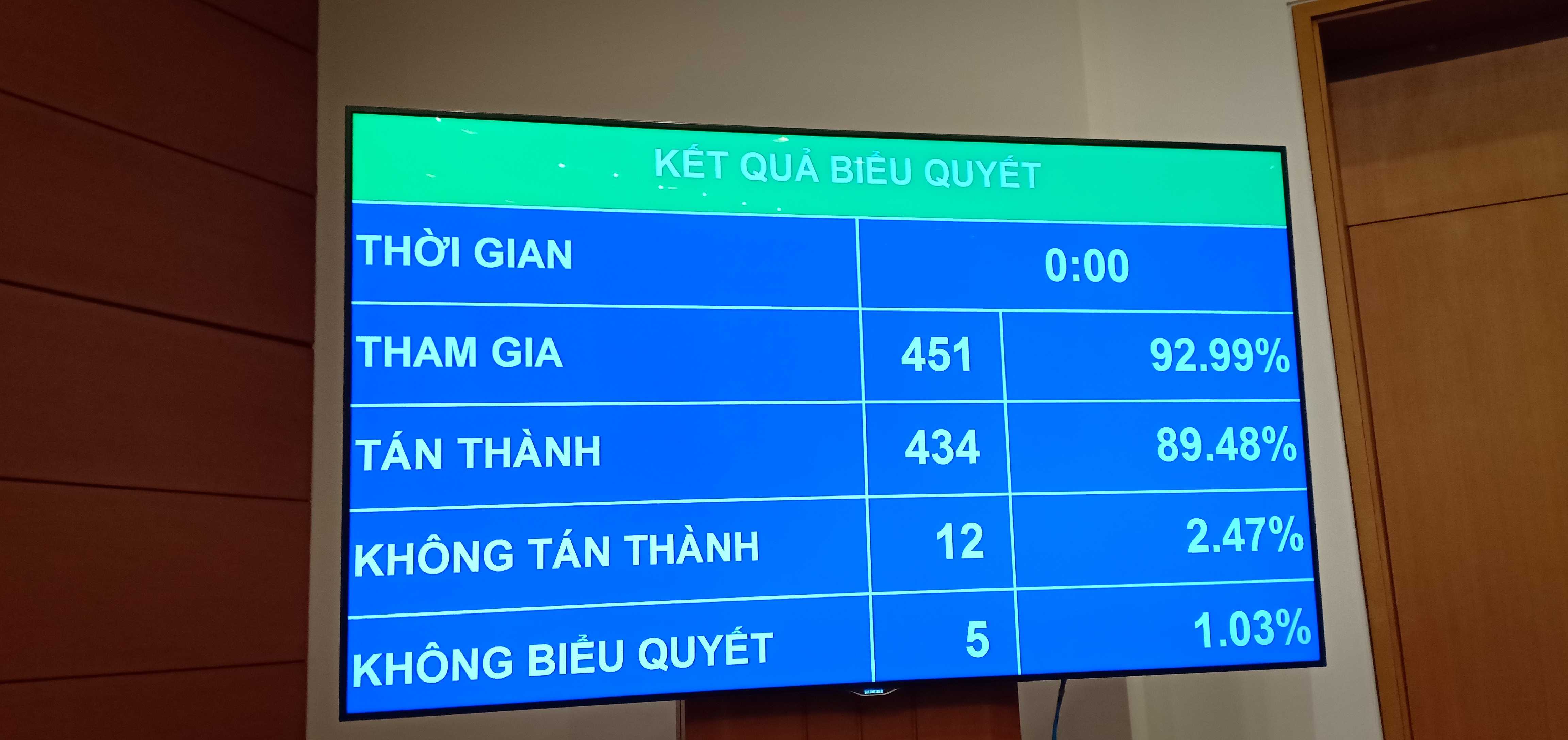 Có 451 đại biểu tham gia biểu quyết Nghị quyết điều chỉnh kế hoạch đầu tư công trung hạn giai đoạn 2016-2020. Kết quả, có 434 đại biểu biểu quyết tán thành tương đương tỷ lệ 89,48% tổng số ĐBQH.