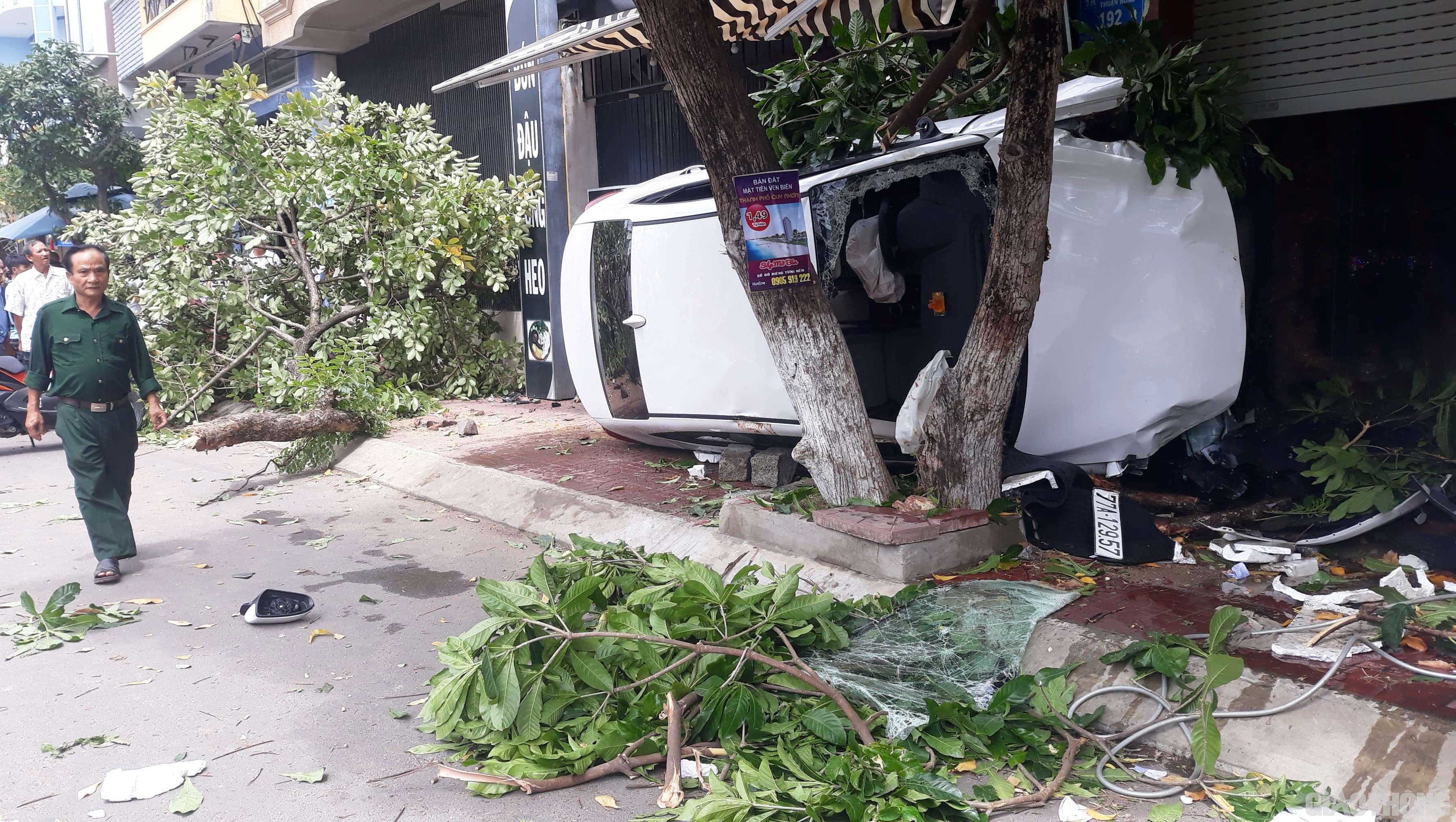Khi xe vừa chạy qua nút đèn đỏ thì bất ngờ lao sang bên trái đường, phóng lên vỉa hè đâm gãy 1 cây lớn trước nhà 196. Sau đó, ô tô lao tiếp tông vào cây lớn trước quán ăn 194, lật nghiêng và mắc kẹt.