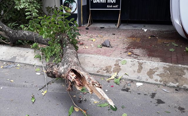 Ô tô con phi lên vỉa hè tông gãy một cây lớn. Ảnh: Dân trí |
