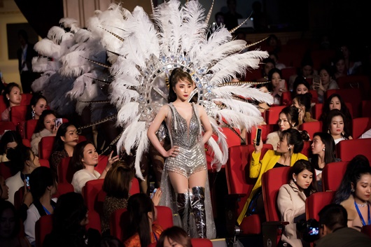 Sau đó không lâu, nữ diễn viên khiến khán giả "đứng ngồi không yên" khi bất ngờ xuất hiện từ phía khán đài sân khấu như một siêu mẫu với hình ảnh cực kỳ nóng bỏng cùng đôi cánh carnaval bằng lông vũ lộng lẫy tiến xuống sân khấu. |