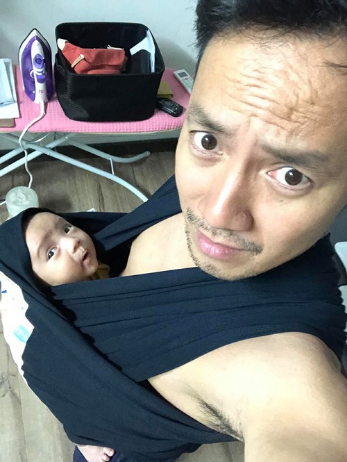 Trong ảnh, ông xã của Thụy Vy say sưa ngắm nhìn bé Finn lúc đang ngủ. Ở một khung hình khác, rapper Tiến Đạt tỏ ra hào hứng khi địu em bé ở trước bụng.