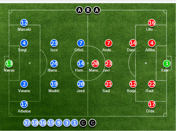 - Một điều khá bất ngờ trong trận đấu này là thủ thành Iker Casillas đã bị loại khỏi đội hình xuất phát. Người đứng trong khung gỗ Real là thủ thành Keylor Navas, người chuyển tới Real đầu mùa hè vừa qua.