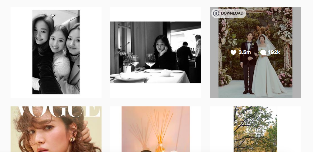 Nhiều hình ảnh vợ chồng Song - Song vẫn còn nằm chễm chệ trên Instagram. Ảnh chụp màn hình. |