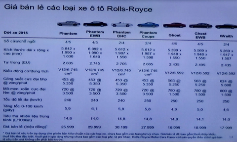 Giá bán lẻ xe Rolls-Royce tại Việt Nam. |