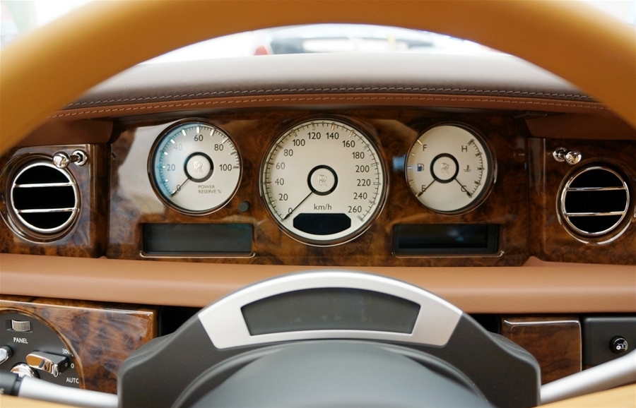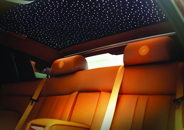 Logo biểu tượng Spirit of Ecstasy mạ vàng cùng họa tiết trống đồng được vẽ (và thêu) bằng tay độc đáo. Nội thất có nhiều chi tiết ốp bằng gỗ óc chó, vô lăng ba chấu bọc da cao cấp cùng hệ thống điều hòa độc lập 2 vùng.