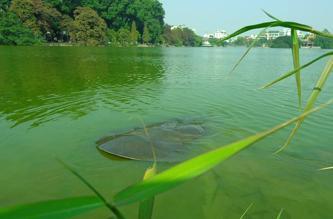 "Cụ" rùa nổi lên phơi nắng ở chân tháp Rùa. (Ảnh: VnExpress). |