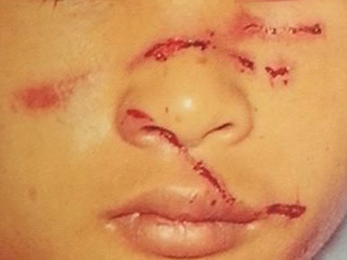 Khuôn mặt đầy sẹo của bé trai do bố đánh. |