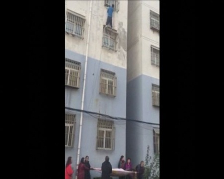 Trong khi đó người dân đứng phía dưới gọi xe cứu hỏa và trải sẵn một chiếc đệm lớn bên dưới đề phòng trường hợp cả Liang và bé trai ngã xuống.