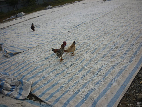 Do không có người trông coi nên các loại gia súc, gia cầm thả rông thỏa sức xả chất thải lên mứt. Chính vì thế, trên các bạt phơi không chỉ có mứt mà đầy rẫy phân gà, phân ngỗng, thậm chí có chỗ còn có cả phân chó và lợn.