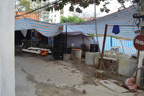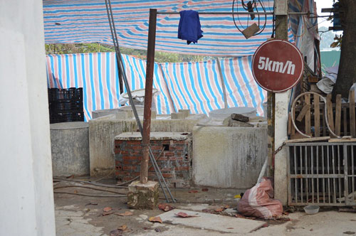 Trong khi cơ sở này chỉ dùng một tấm bạt để che hướng nhìn ra mương nước. Khu ngâm mứt thì lụp xụp và đầy rẫy rác thải.