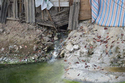 Ra phía đầu làng, chúng tôi gặp ngay một cơ sở làm mứt bên mương nước thải. Phía sau nơi ngâm mứt của cơ sở này là một mương nước thải sinh hoạt bốc mùi hôi thối.