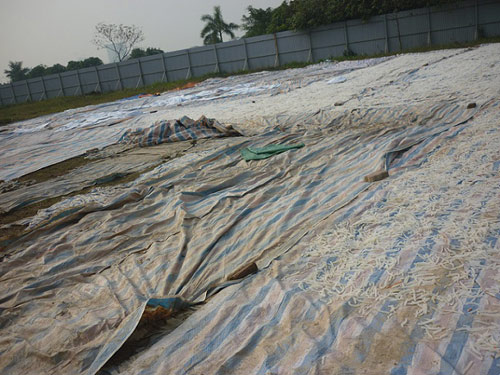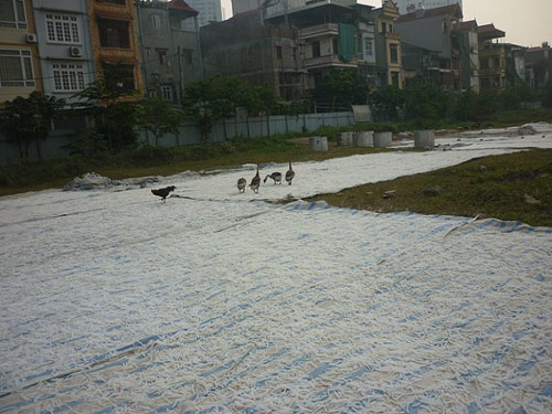 Theo xe chở mứt đi phơi, chúng tôi có mặt tại một bãi đất bỏ trống thuộc một dự án… Trước mắt chúng tôi là khung cảnh phơi mứt của các cơ sở sản xuất trong làng. Hàng chục chiếc bạt được trải dưới đất, công nhân mặc sức dẫm lên mứt, mặc dù giày dép đang bám đầy bùn đất.