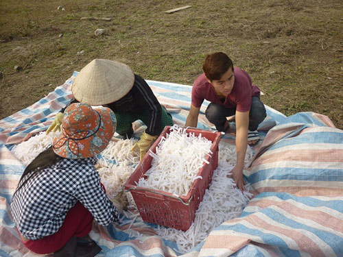 Cảnh công nhân đi thu lại mứt sau khi phơi. |
