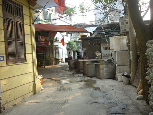 Theo khảo sát của chúng tôi, tại ngõ 126, đối diện với Nhà hát chèo Quân đội là con đường đất, hai bên là rác thải dẫn vào một cở sở làm mứt. Đoạn đường đất đầy rác lại là nơi đặt “xưởng chế biến” của cơ sở.