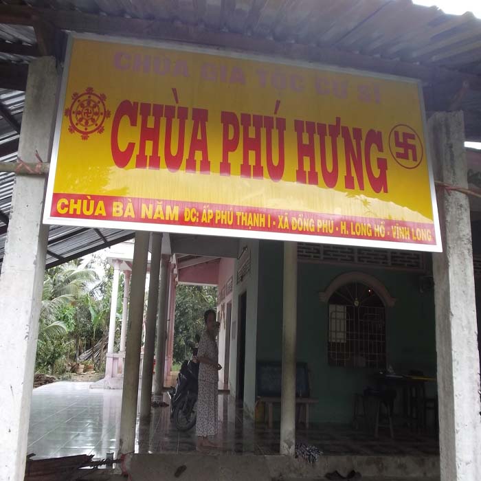 Đập vào mắt PV là tấm bảng hiệu màu vàng, có dòng chữ đỏ với nội dung "Chùa gia tộc cư sĩ chùa Phú Hưng, chùa bà Năm, địa chỉ ấp Phú Thạnh 1, xã Đồng Phú, huyện Long Hồ, tỉnh Vĩnh Long" dựng ngay trước cửa nhà.