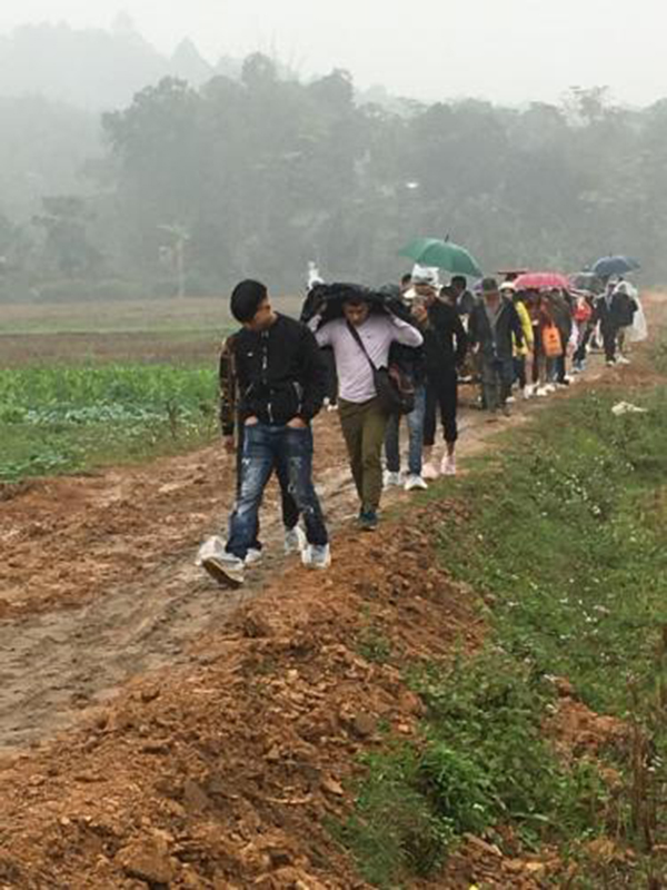Vì xe ôtô không thể vào được, gia đình đã chọn xe trâu để đưa cô dâu chú rể ra đường nhựa. Những khách mời trong đoàn đưa dâu phải dùng túi nilon để bọc lại giày dép mới qua được đoạn đường này.