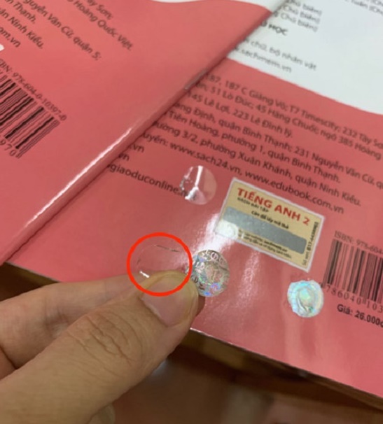 Sách giáo khoa giả được dán tem chống hàng giả không khác với sách thật. |